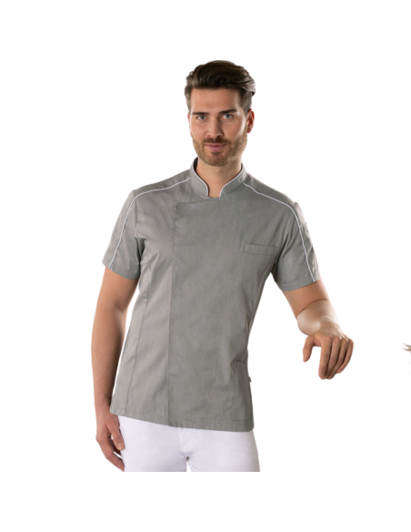 La casacca Valerio a manica corta, versione maschile del modello Tania, hauna linea elegante e dinamica, attenta ai dettagli.Ha una vestibilità aderente, valorizzata dai tagli che asciugano la silhouettedel capo.Il collo alla coreana è bordato da un piping a contrasto che viene ripresosulle spalle fino alla manica.