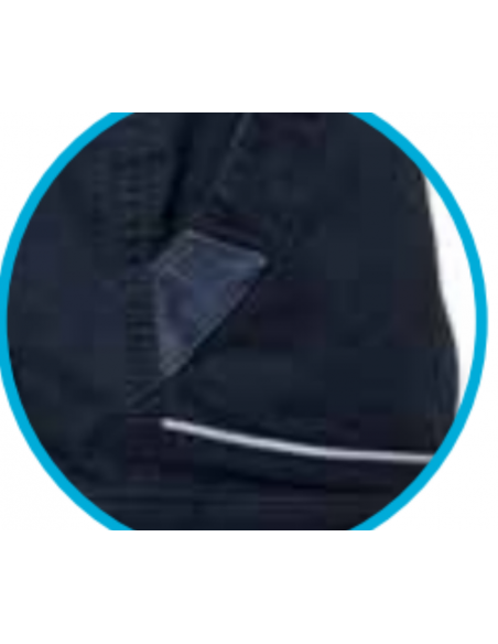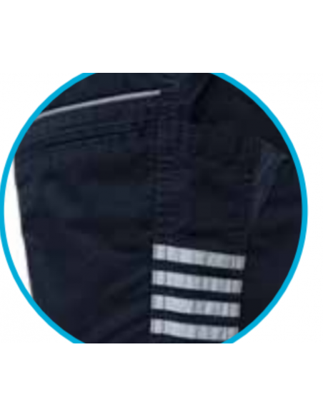 Profili orizzontali nel taglio delle tasche anteriori e 4 bande su tasca porta metro in tessuto rifrangente.
